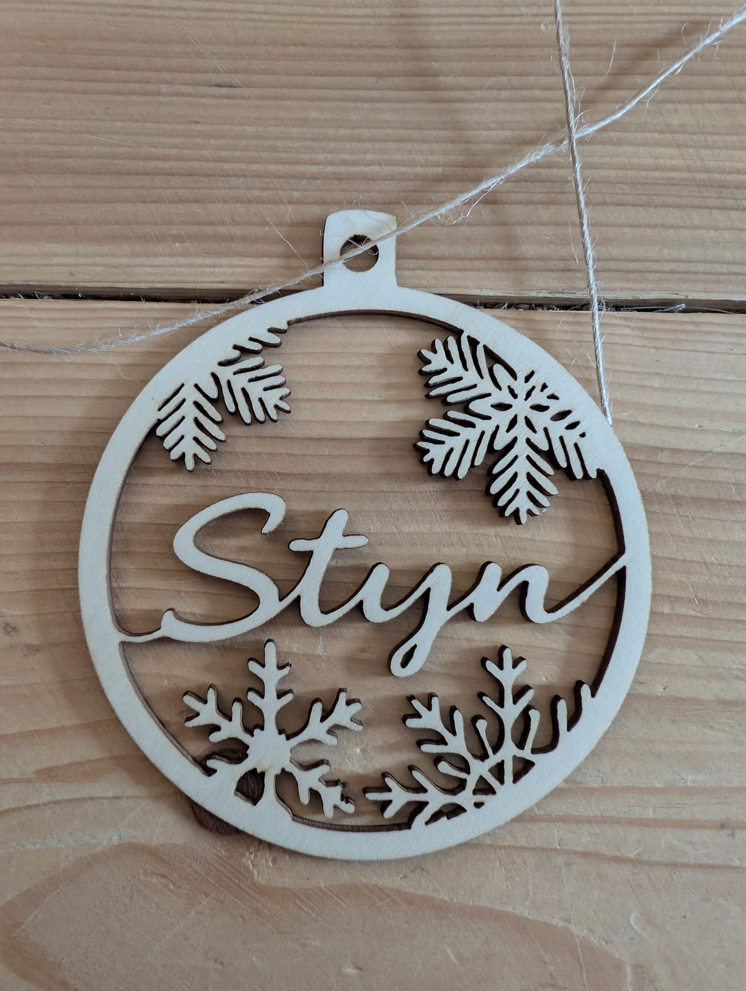 Voeg een persoonlijke touch toe aan je kerstboom met dit stijlvolle houten ornament. Laser-gesneden uit duurzaam hout, met sierlijke sneeuwvlokken en dennentakken rondom de naam “Stijn” in elegant cursief lettertype.