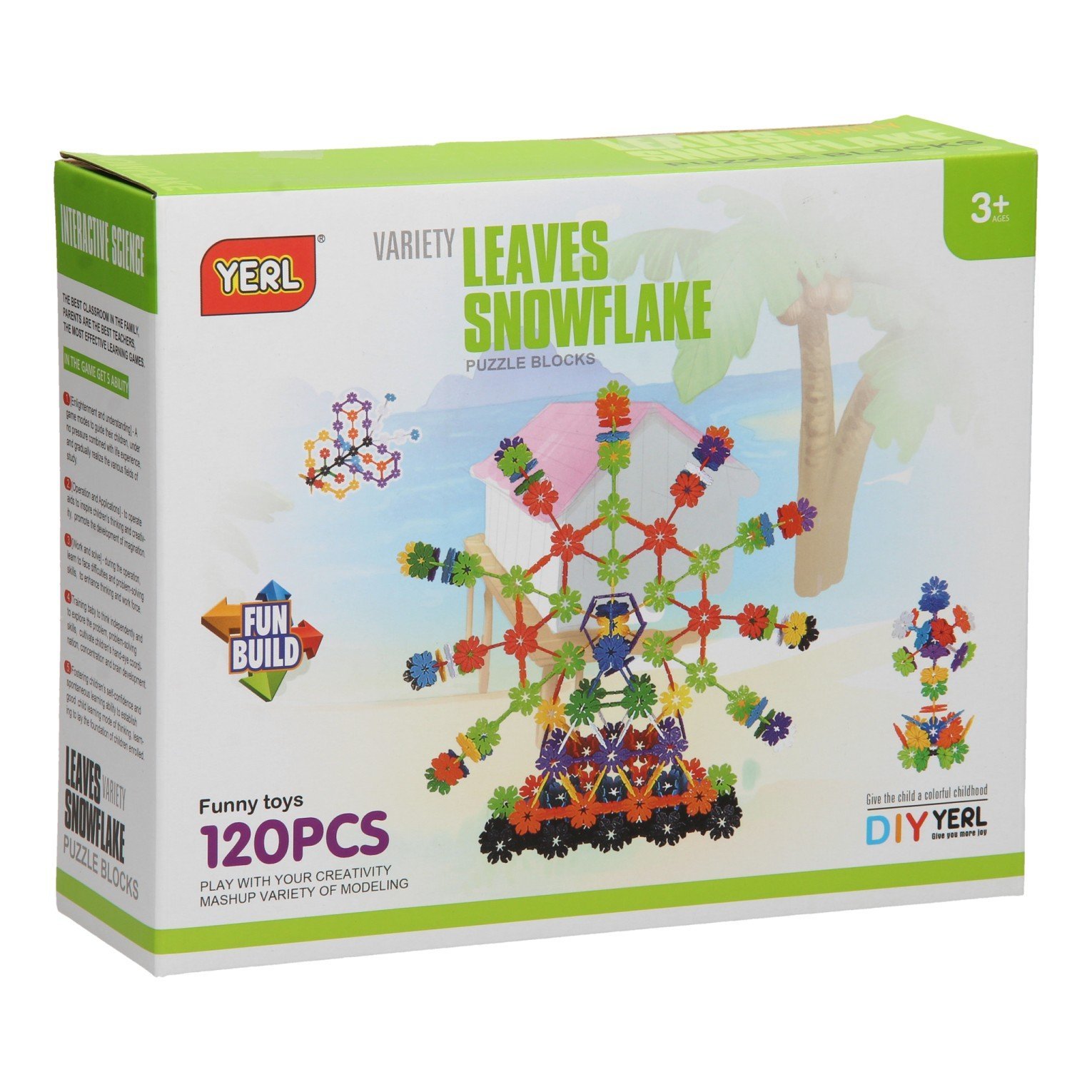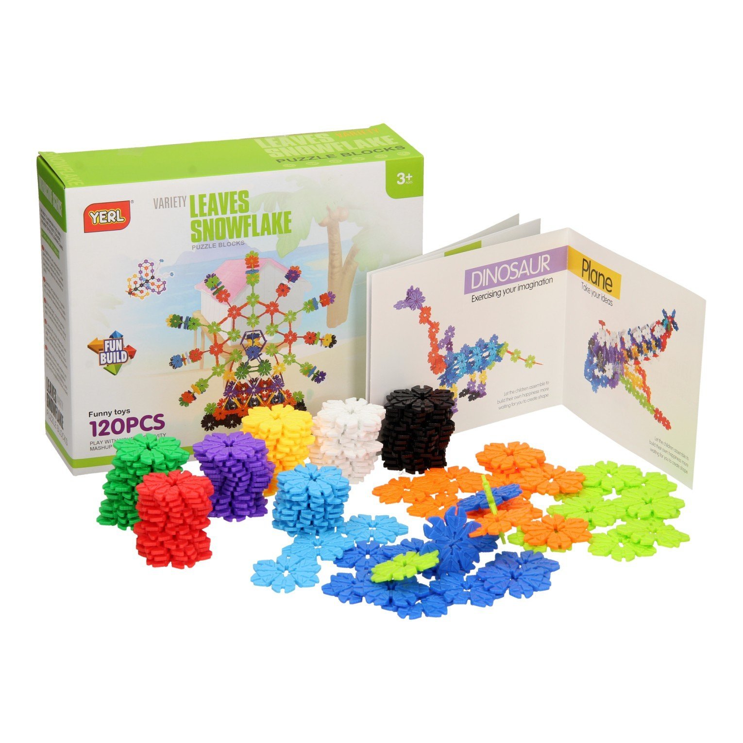 Een reuzenrad, vliegtuig of dinosaurus bouwen, het kan allemaal met deze 120 bouwelementen! De gekleurde puzzelblokjes hebben de vorm van sneeuwvlokken, waardoor ze op vele verschillende manieren in elkaar passen. De bouwelementen zijn 4 centimeter bij 4 centimeter groot. Bouwpret gegarandeerd met deze set! De set bestaat uit 120 kunststof onderdelen.
