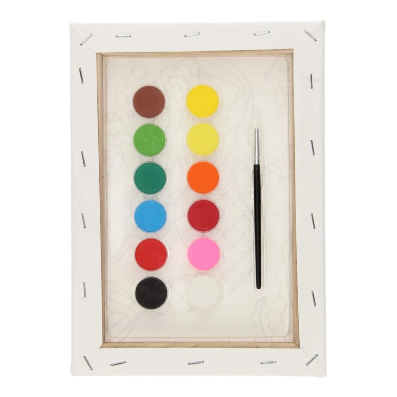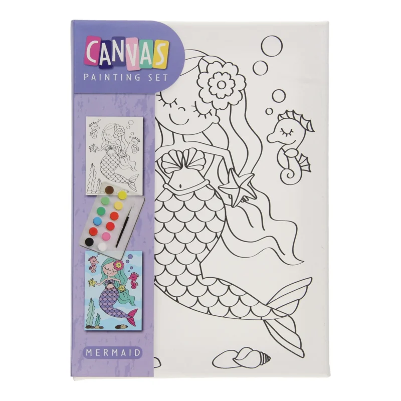 Deze schilderset bestaat uit een canvas met afgebeelde Zeermeermin en pallet met 12 kleuren verf en een penseel.