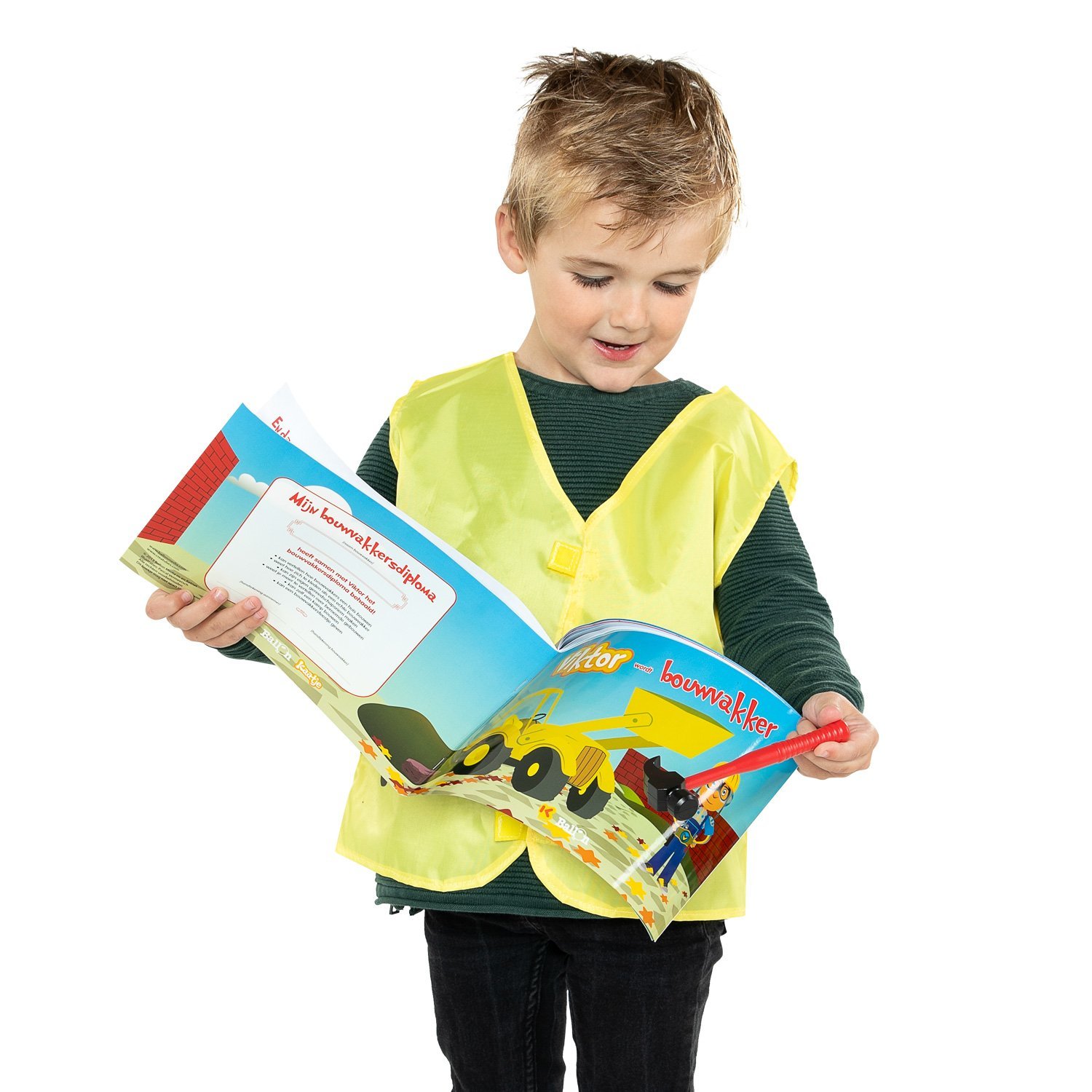 Inhoud: Activiteitenboek (32 pagina’s), bouwvakkersvest, hamertje