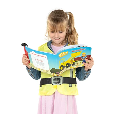 In de tube vind je een boekje van 32 pagina’s met kleurplaten en leuke activiteiten. Denk aan interessante bouwvakkersweetjes, ideeën voor schminken en verkleden, knutselopdrachten en handige tips voor een themafeestje. Daarnaast bevat de set een stoer bouwvakkersvest en een stevig hamertje, zodat kinderen zich echt kunnen omtoveren tot een echte bouwvakker.