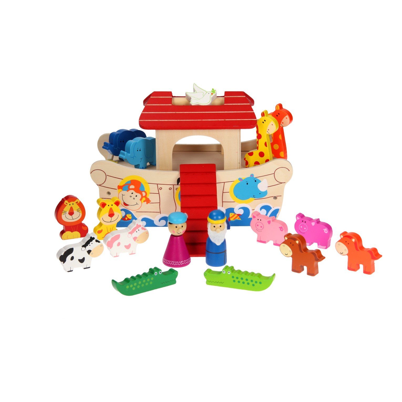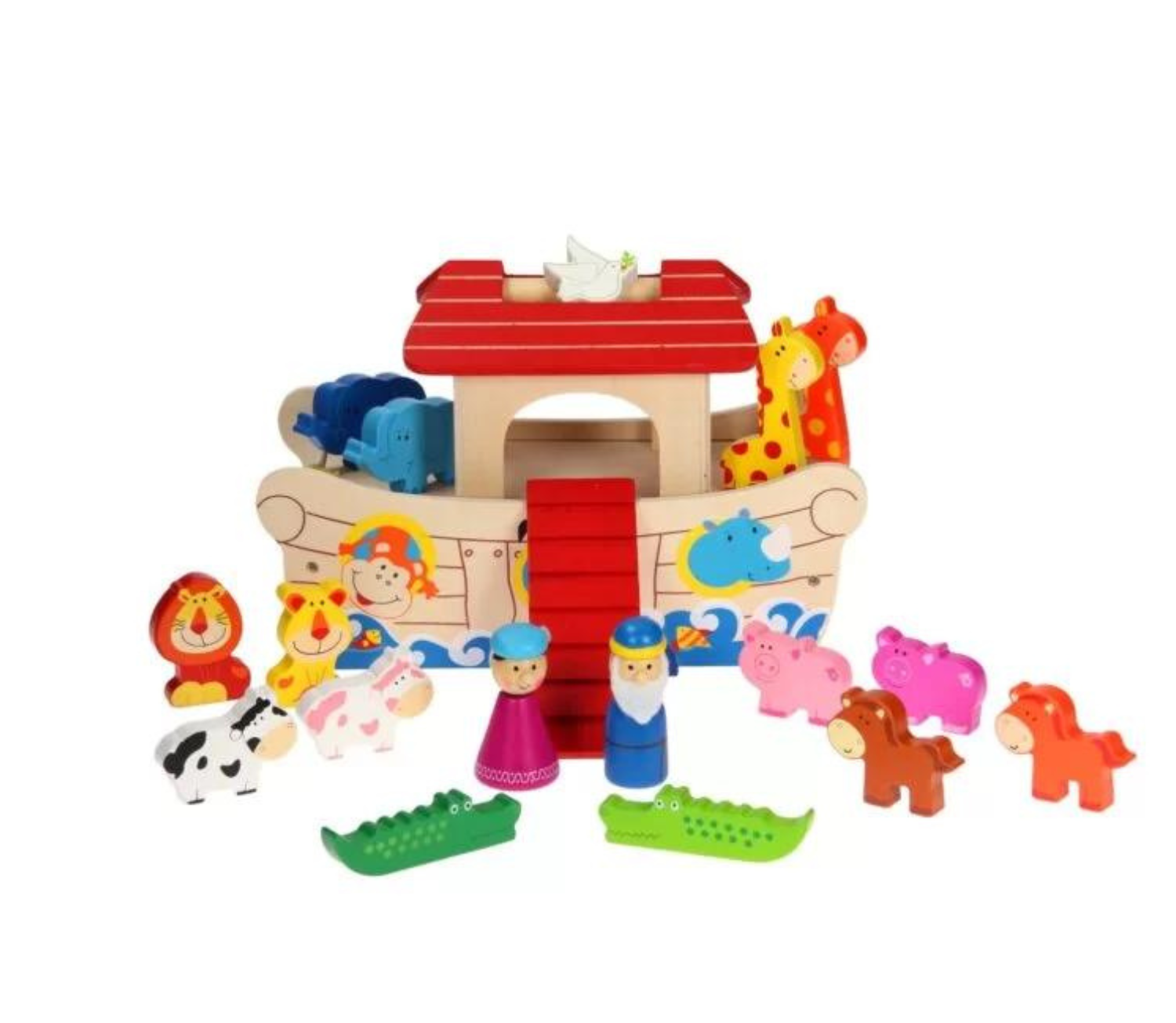 Noach hoorde van God dat hij een ark moest bouwen en dieren mee moest nemen omdat er een vloedgolf zou komen. En zo deed hij. Deze Draagbare Ark van Noach is makkelijk met je mee te nemen, waardoor je overal ermee kunt spelen. Deze 19-delige set is gemaakt van kwaliteitshout en bevat 2 leeuwen, 2 koeien, 2 paarden, 2 varkens, 2 krokodillen, 2 olifanten, 2 giraffen, 1 duif, 1 ladder en Noach en zijn vrouw.