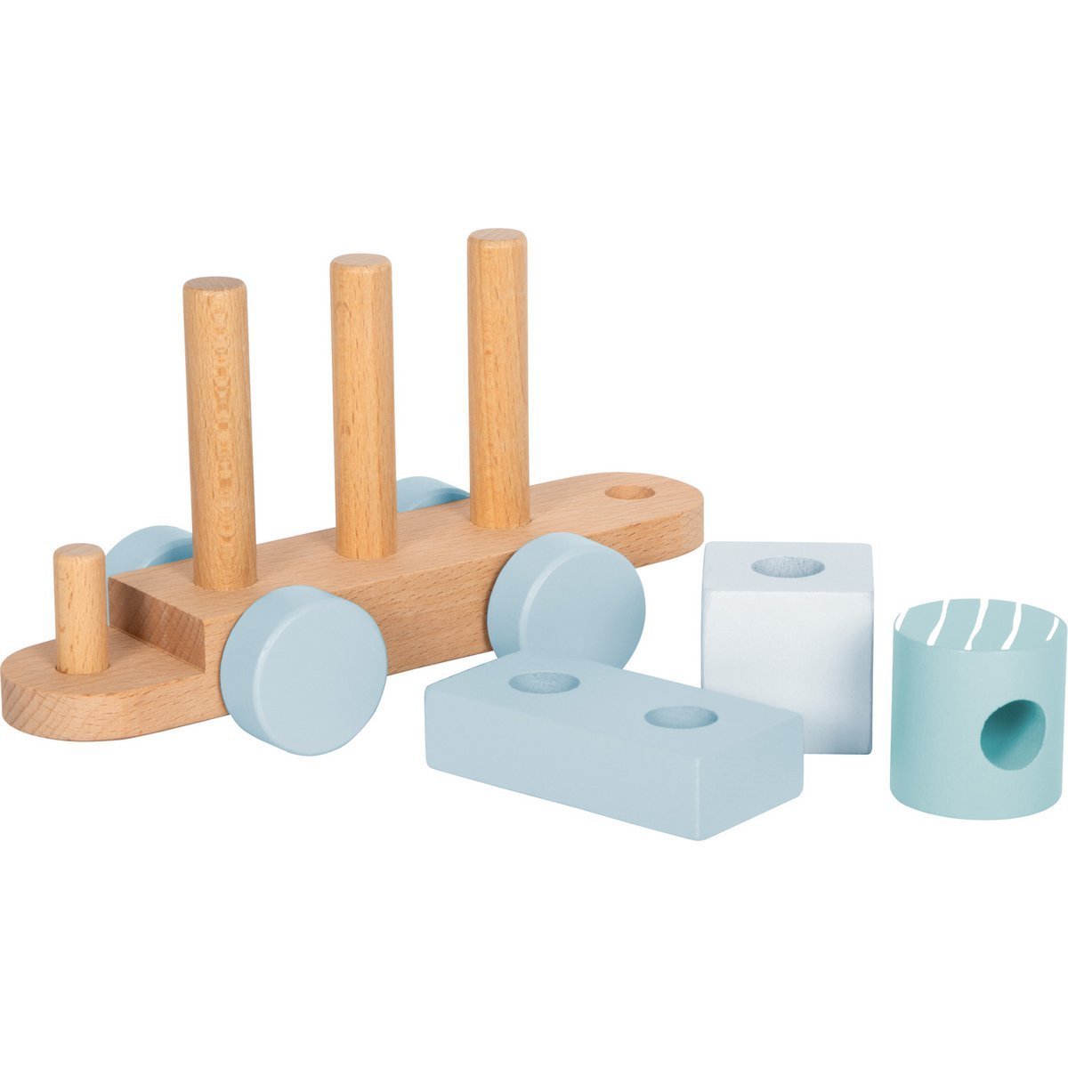 De Houten Trein Blauw is een veelzijdige stapeltrein die kinderen uitnodigt om te bouwen, te stapelen en creatief te spelen. De set bestaat uit een locomotief, twee wagons en 14 losse plug‑in elementen die naar wens kunnen worden gecombineerd. De onderdelen kunnen ook los worden gebruikt als bouwblokken, waardoor de trein extra lang speelplezier biedt.