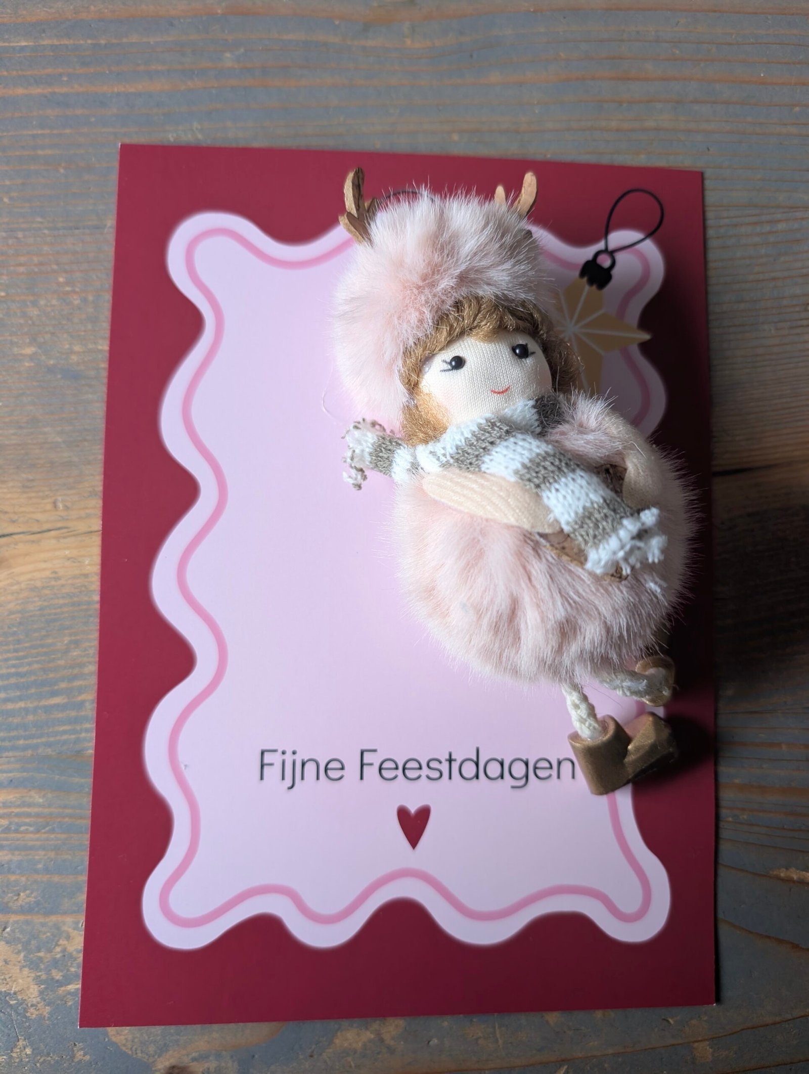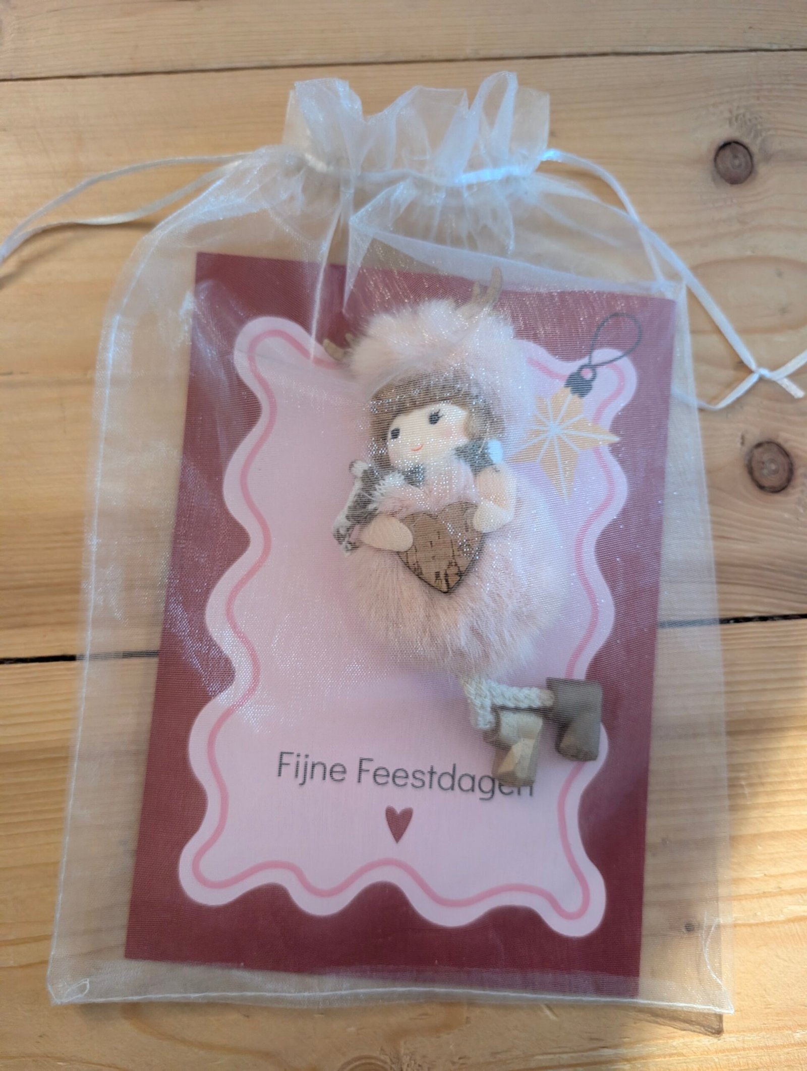 Een warme kerstgroet met een winters knipoog! Deze A5-kaart is voorzien van de tekst Fijne Feestdagen en verpakt in een elegante organza zak (20×30 cm). Binnenin vind je een zachte pluche engeltje in winteroutfit in de kleur roze, compleet met sjaal, muts en gouden schoentjes– klaar om je boom extra sfeer te geven.