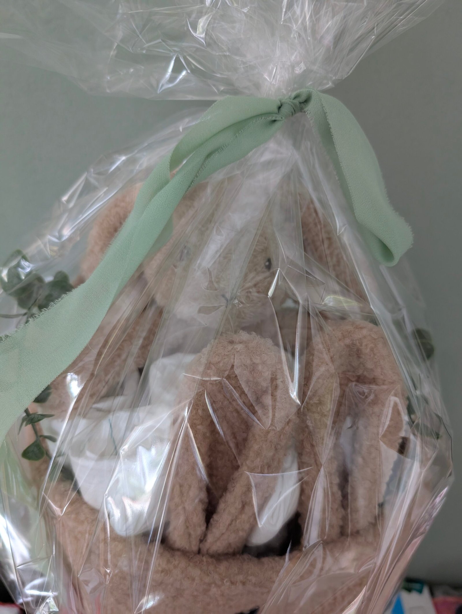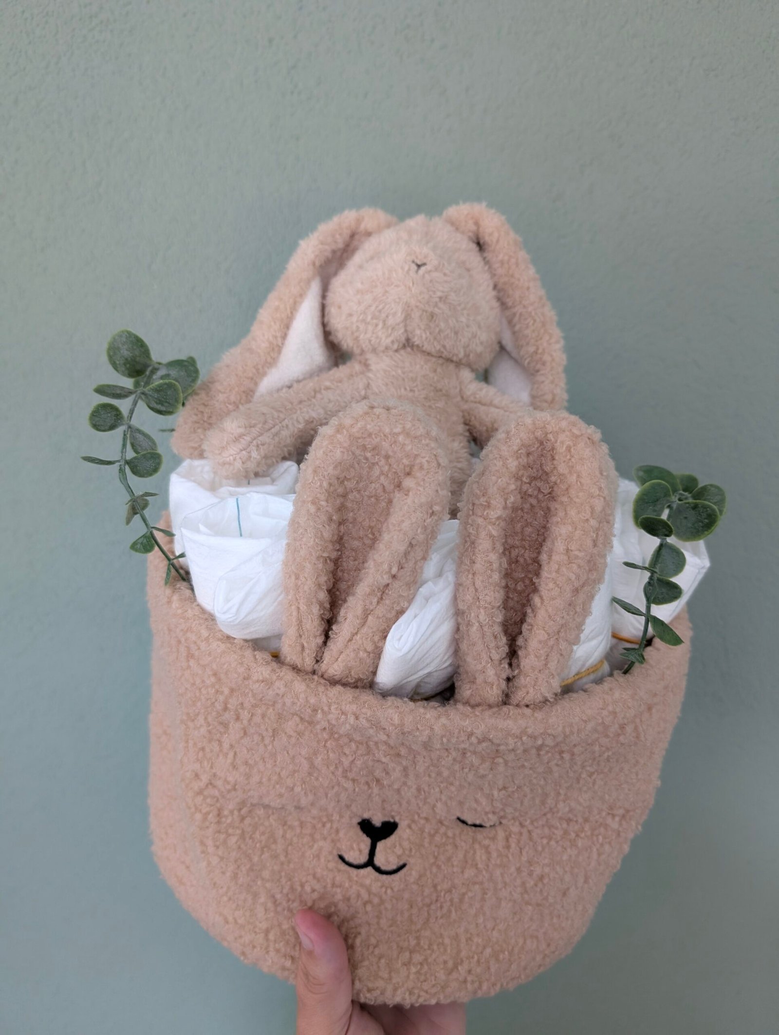 De bruine mand is afgewerkt met twee groene decoratieve sprieten, waardoor het geheel een natuurlijke en luxe uitstraling krijgt. Dankzij de neutrale kleuren is dit kraamcadeau geschikt voor zowel jongens als meisjes. De konijnenmand is niet alleen praktisch, maar ook een prachtige toevoeging aan de babykamer.