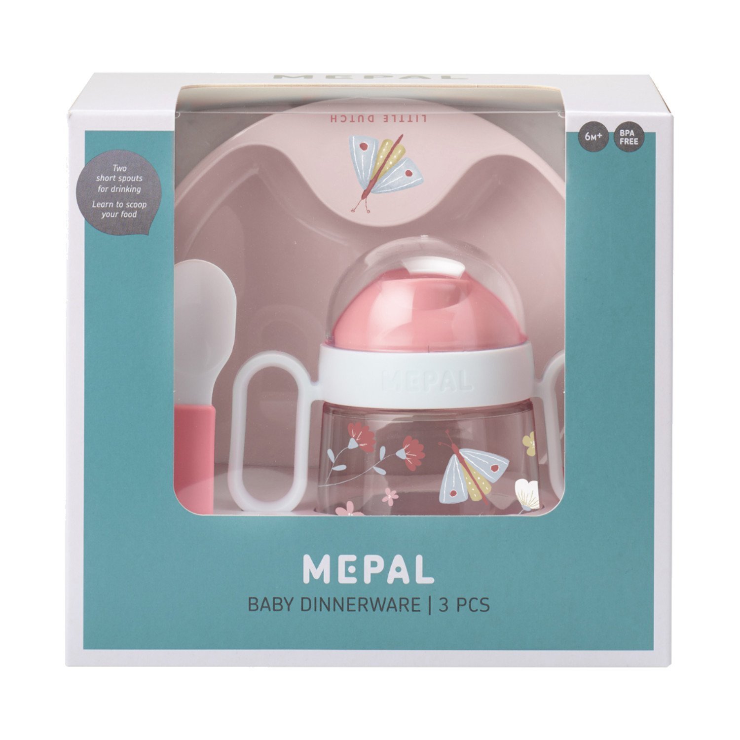 Met de Little Dutch Flowers & Butterflies Dinerset 3-Delig heb je een een leuke dinerset voor je kindje. De set bestaat uit een fijne antilekbeker, een oefenbord en een lepel voor kleine maaltijden. Alle items zijn voorzien van een stijlvol printje waardoor het voor je kindje leuk blijft om te eten. verder is het dinerset vaatwasserbestendig.