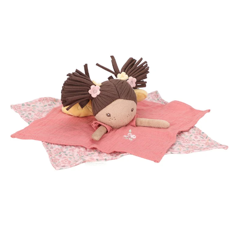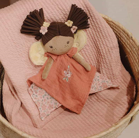 Laat je kleintje wegdromen in een wereld vol vrolijke bloemen met dit prachtige feeën knuffeldoekje. Haar zachte vleugels, geborduurde details, donkerbruine staartjes en oudroze jurkje maken haar perfect voor kleine handjes om vast te pakken en te knuffelen. Deze fee stimuleert de zintuigen en biedt comfort en geborgenheid. Ideaal voor dutjes of onderweg!