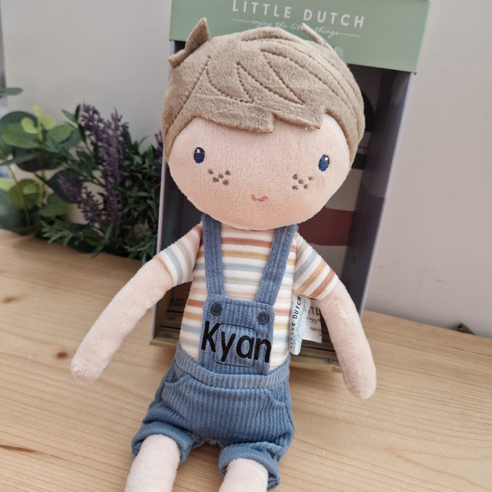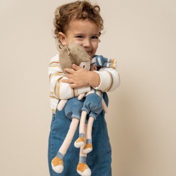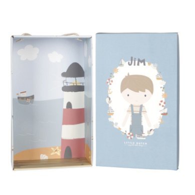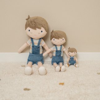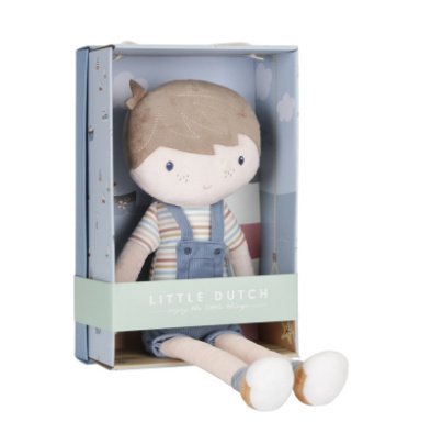 De leuke pluche knuffelpop Jim in zijn stoere tuinpak is zacht en fijn om mee te knuffelen. Jim kan rechtop blijven zitten en rijdt graag met je mee in de houten poppenbuggy van Little Dutch.