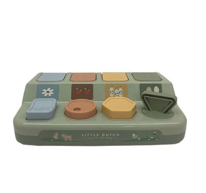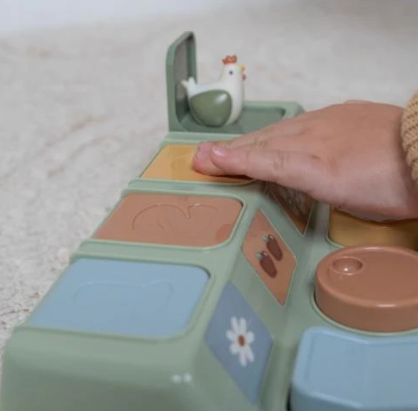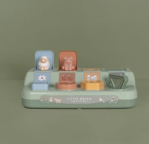Kiekeboe! Welk boerderijdier komt er tevoorschijn als je aan de knoppen zit? Is het een schaap, varken, koe of een kip? Leuk aan de Pop-Up dieren is dat je er samen met je kindje een leuk spelletje van kan maken. Welk dier loopt graag tussen de bloemetjes in de wei? Welk boerderijdier is gek op appels? Van welk dier komt je melk? Welk dier legt er een ei? Dit eenvoudige spel geeft je kindje erg veel plezier. Terwijl je kindje de verschillende boerderijdieren ontdekt, ontwikkeld deze spelenderwijs zijn/haar probleemoplossende en fijne motorische vaardigheden.