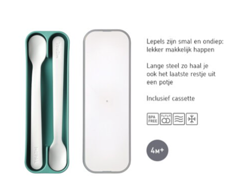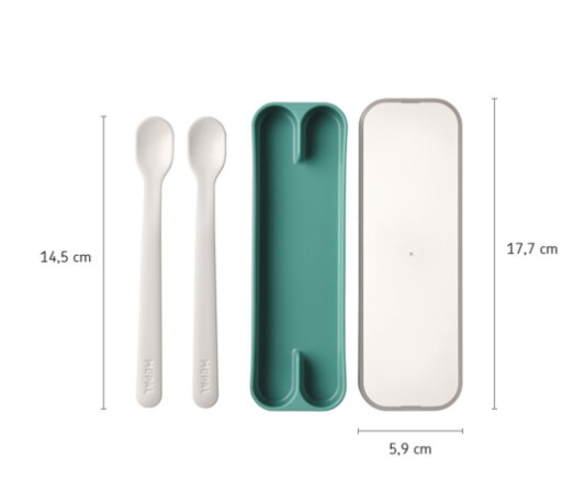 De set bestaat uit twee lepels in een praktisch opbergdoosje, perfect voor thuis én onderweg. Na gebruik mogen de lepels gewoon in de vaatwasser. Natuurlijk zijn ze BPA-vrij en volledig veilig voor kleine eters.