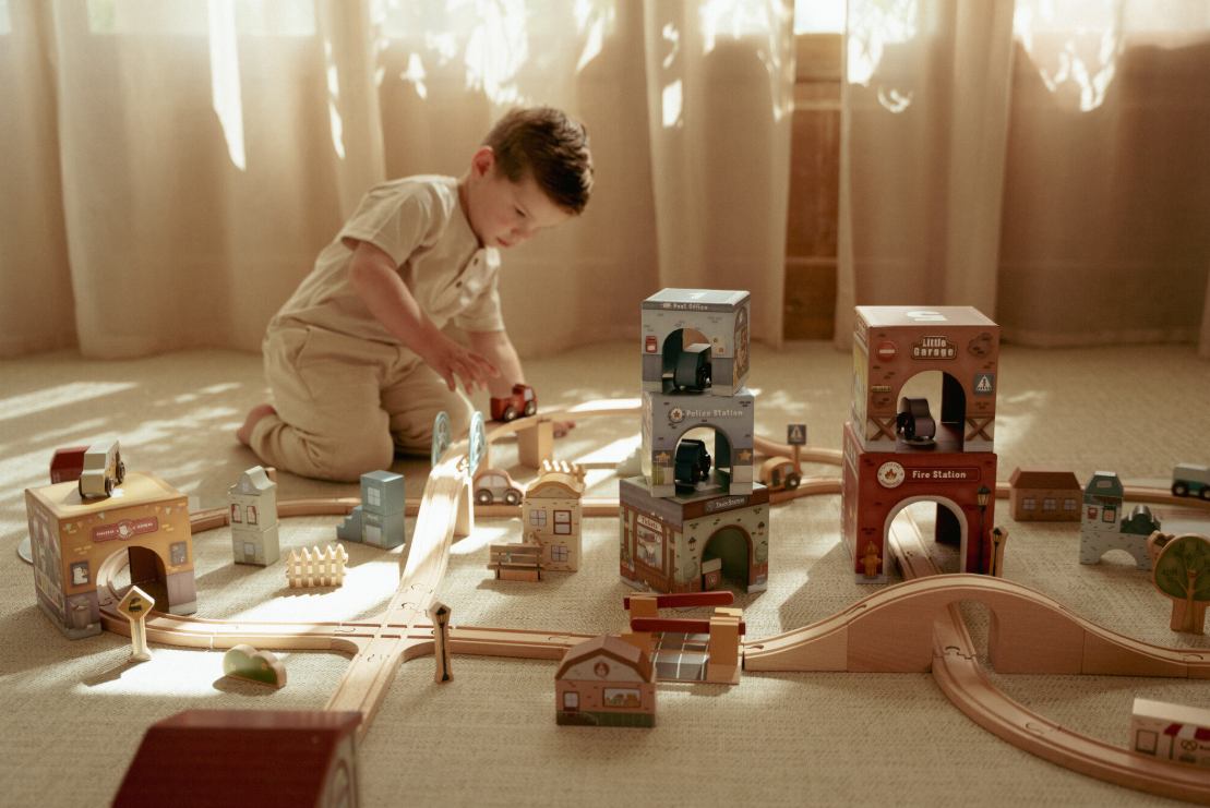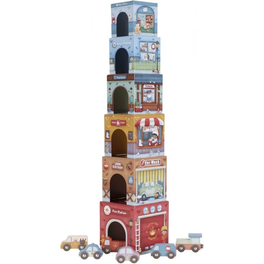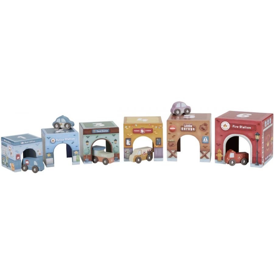 De set bestaat uit stevige stapelblokken met gedetailleerde illustraties van gebouwen zoals een brandweerkazerne, politiebureau, postkantoor, garage en treinstation. Elke blok heeft een opening waar de zes houten auto’s doorheen kunnen rijden – zo ontstaan er telkens nieuwe verhalen en rollenspellen.