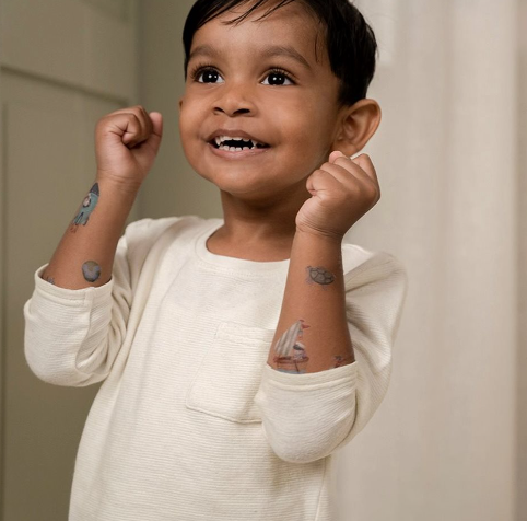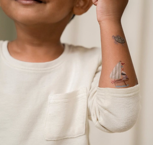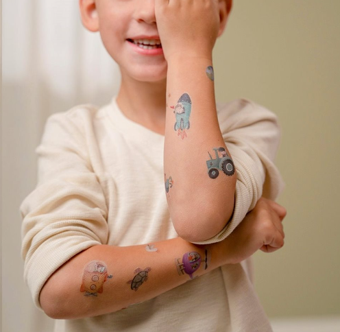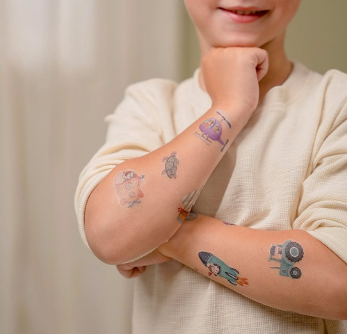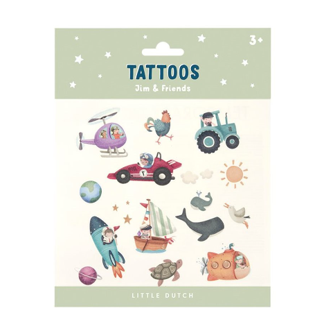 Een setje met vrolijke tattoos ‘Jim & Friends’ van Little Dutch. Het kleurrijke setje bestaat uit stoere tijdelijke kindertatoeages van Jim en zijn vriendjes. Druk de tattoos stevig op de huid, dep me teen nat doekje, even wachten en voilà!