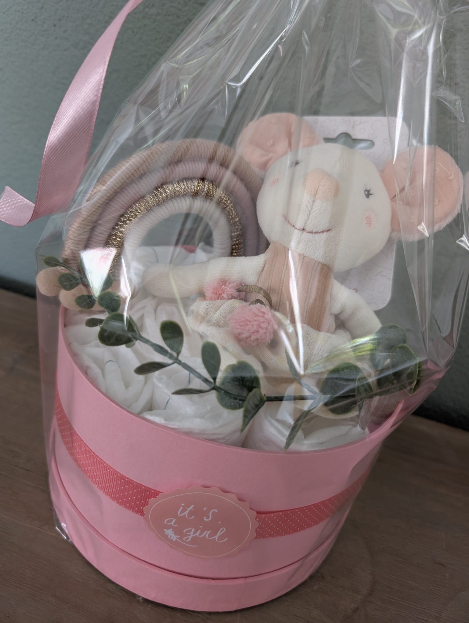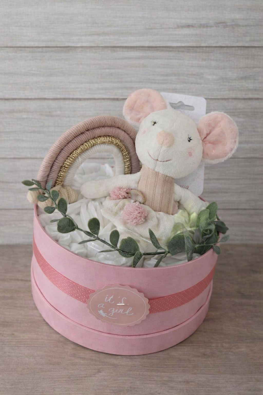 De Luiertaart Roze met Knuffelmuis is een lief en praktisch kraamcadeau voor een pasgeboren meisje. Handgemaakt en stijlvol gepresenteerd, combineert dit cadeau zachte luiers met een knuffelvriendje dat jarenlang gebruikt kan worden.
