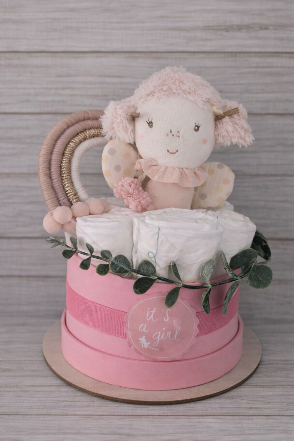 De Mini Luiertaart Roze Rammelaar Fee is een compact en stijlvol kraamcadeau, ideaal voor een pasgeboren meisje. Handgemaakt en zorgvuldig samengesteld, combineert dit cadeau praktische luiers met een zacht, speels speeltje.