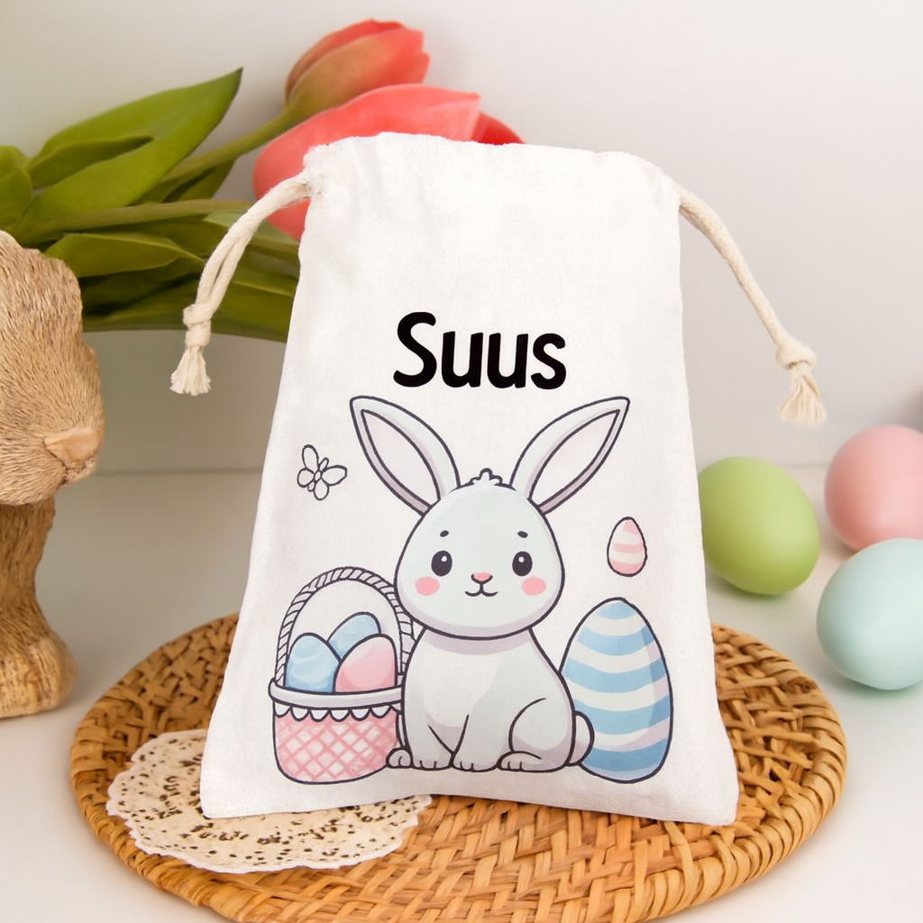 - Design: Een vrolijke paashaas met een mandje, in frisse lentekleuren.