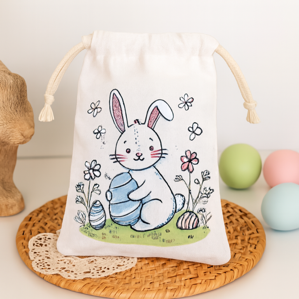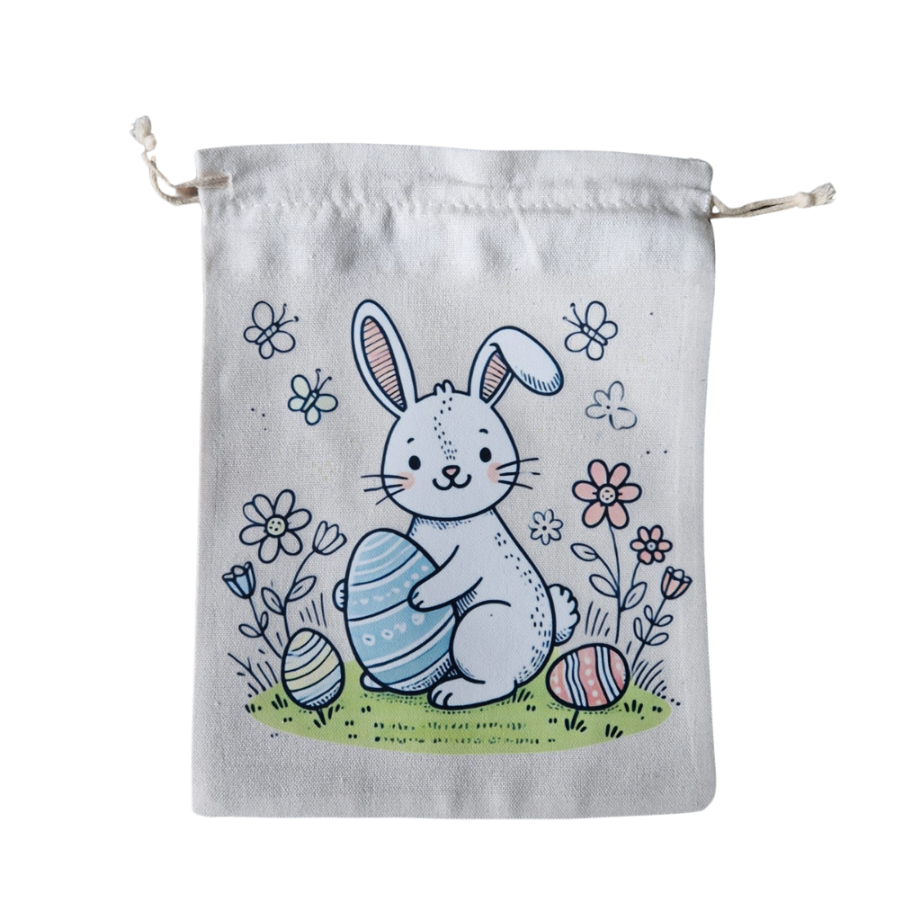 Het linnen tasje met trekkoord (23 x 17,5 cm) is versierd met een vrolijke afbeelding van een paashaas en kleurrijke paaseieren.