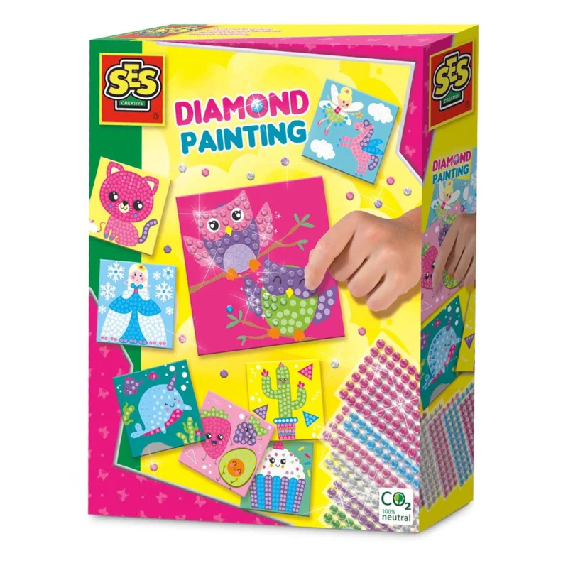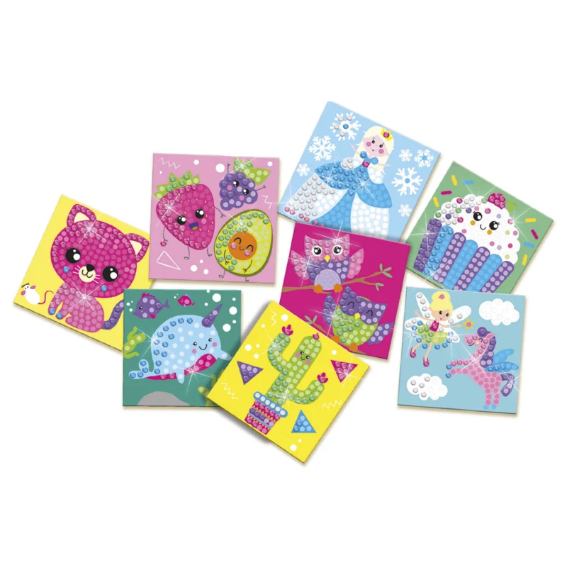 Diamond painting junior. Doordat de glimmende diamantstippen zelfklevend zijn, plakken ze heel gemakkelijk op de kleurrijke kaarten! Inhoud: 1080 diamant stickers in 6 kleuren en 8 mozaïekkaarten. Wordt in full-colour doos geleverd. Geschikt voor kinderen vanaf 3 jaar.